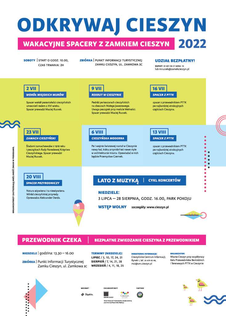 Już od pierwszego weekendu lipca ruszają cykliczne spotkania: WAKACYJNE SPACERY Z ZAMKIEM CIESZYN oraz PRZEWODNIK CZEKA - bezpłatne zwiedzanie Cieszyna z przewodnikiem, a także LATO Z MUZYKĄ - cykl koncertów w Parku Pokoju. ZAPRASZAMY!!!