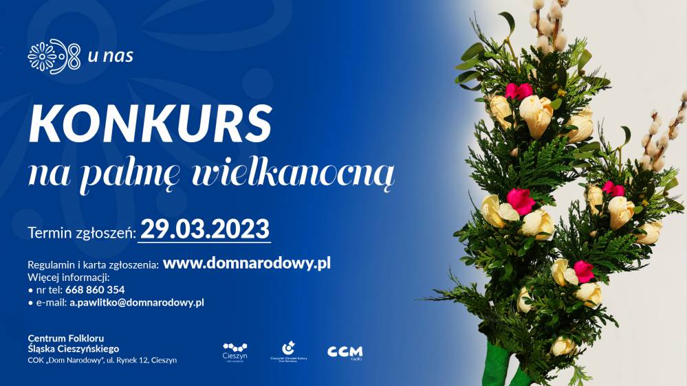 Cieszyński Ośrodek Kultury "Dom Narodowy" i Centrum Folkloru Śląska Cieszyńskiego zapraszają mieszkańców regionu do wzięcia udziału w Konkursie na Palmę Wielkanocną. Konkurs dedykowany jest dla dzieci, młodzieży, dorosłych i całych rodzin! Konkurs przeznaczony jest zarówno dla dzieci, jak i dorosłych mieszkańców Śląska Cieszyńskiego po obu stronach Olzy. Uczestnicy konkursu mają za zadanie wykonać palmę wielkanocną. Zalecana technika wykonania to materiały naturalne, jednak ocenie podlegać będzie w głównej mierze kreatywność!