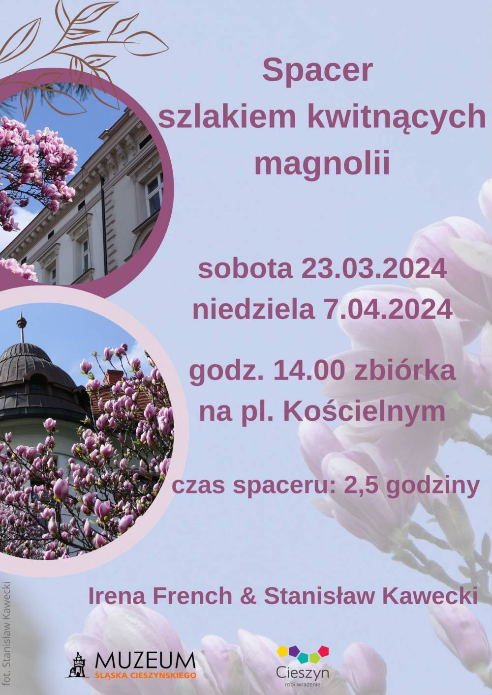 Jako że przecie NAJPIĘKNIEJSZE MAGNOLIE KWITNĄ W CIESZYNIE, tradycyjnie już zapraszamy Państwa na SPACER SZLAKIEM KWITNĄCYCH MAGNOLII – tej wiosny dwukrotnie, by dać Państwu możliwość wyboru terminu oraz by wyjść naprzeciw wiosennej aurze, która lubi zaskakiwać!