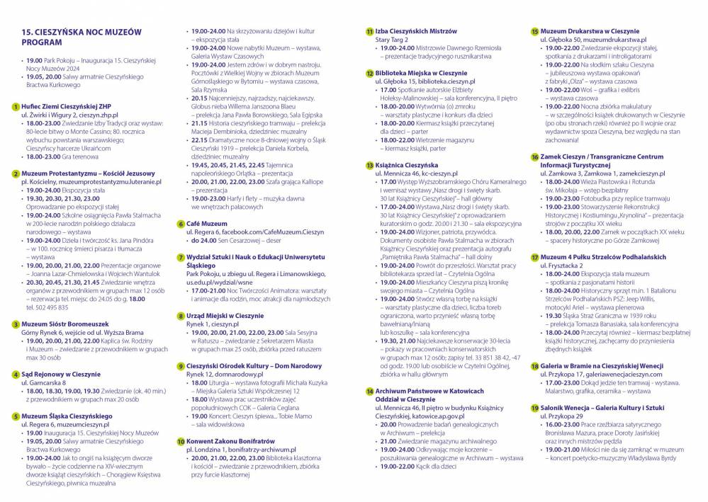 Cieszyńskie ośrodki i instytucje kultury, muzea, biblioteki i kościoły zapraszają po raz 15 w swoje progi! Szczegółowe programy i imprezy towarzyszące już wkrótce umieścimy i publikować będziemy w wydarzeniu oraz na łamach prasy i lokalnych mediów. Trwa "dopinanie na ostatni guzik" atrakcji dla Państwa i turystów planujących nas odwiedzić!