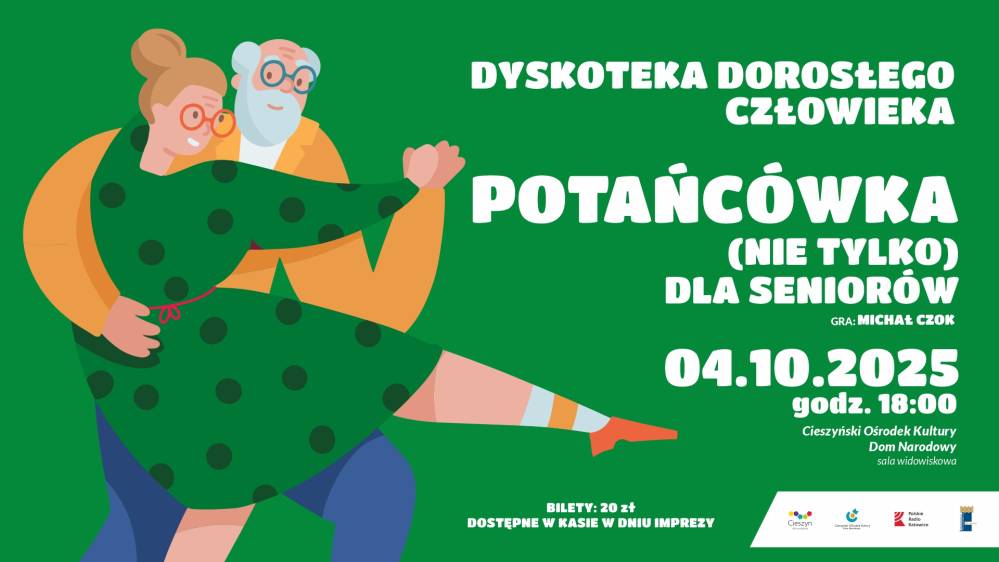 Cieszyński Ośrodek Kultury "Dom Narodowy" i Cieszyński Uniwersytet Trzeciego Wieku zapraszają na Dyskotekę Dorosłego Człowieka, czyli potańcówkę (nie tylko) dla seniorów! Wydarzenie odbędzie się w sobotę 4 października 2025 o godzinie 18:00 w sali widowiskowej Domu Narodowego w Cieszynie. Do zabawy zagra Michał Czok!