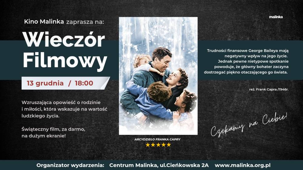 Centrum Malinka zaprasza na wieczór filmowy z projekcją filmu „To wspaniałe życie” w reżyserii Franka Capry.