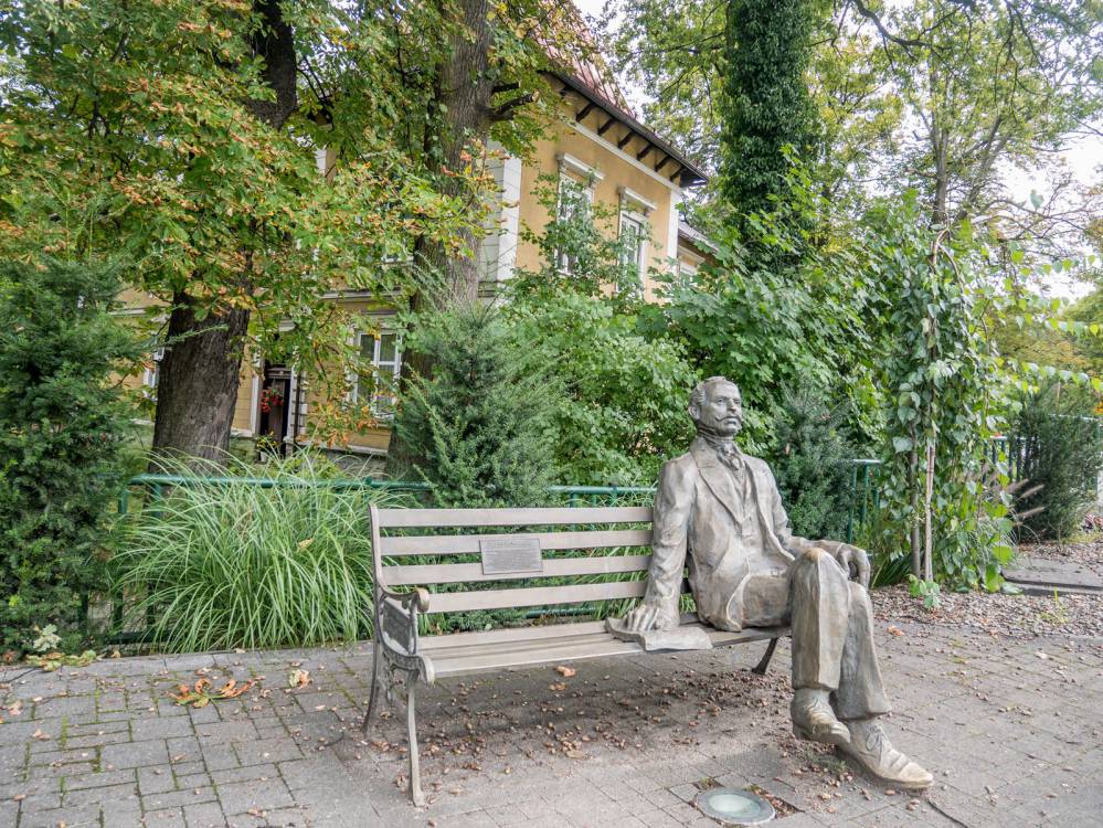 Niebieski szlak rowerowy nr 12: Jaworze - Ustroń, Park Zdrojowy w Jaworzu, ławeczka z hrabią Maurycym Saint Genois, fot. Damian Berłowski - roweremposlasku.pl