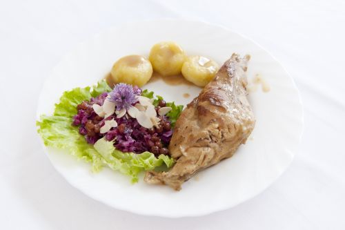 Gdy królik jest już miękki zaprawić sos śmietanką wymieszaną z mąką i dusić na bardzo małym ogniu ok. 10 minut. Podawać z białymi kluseczkami i surówką z modre kapusty i borówek leśnych.