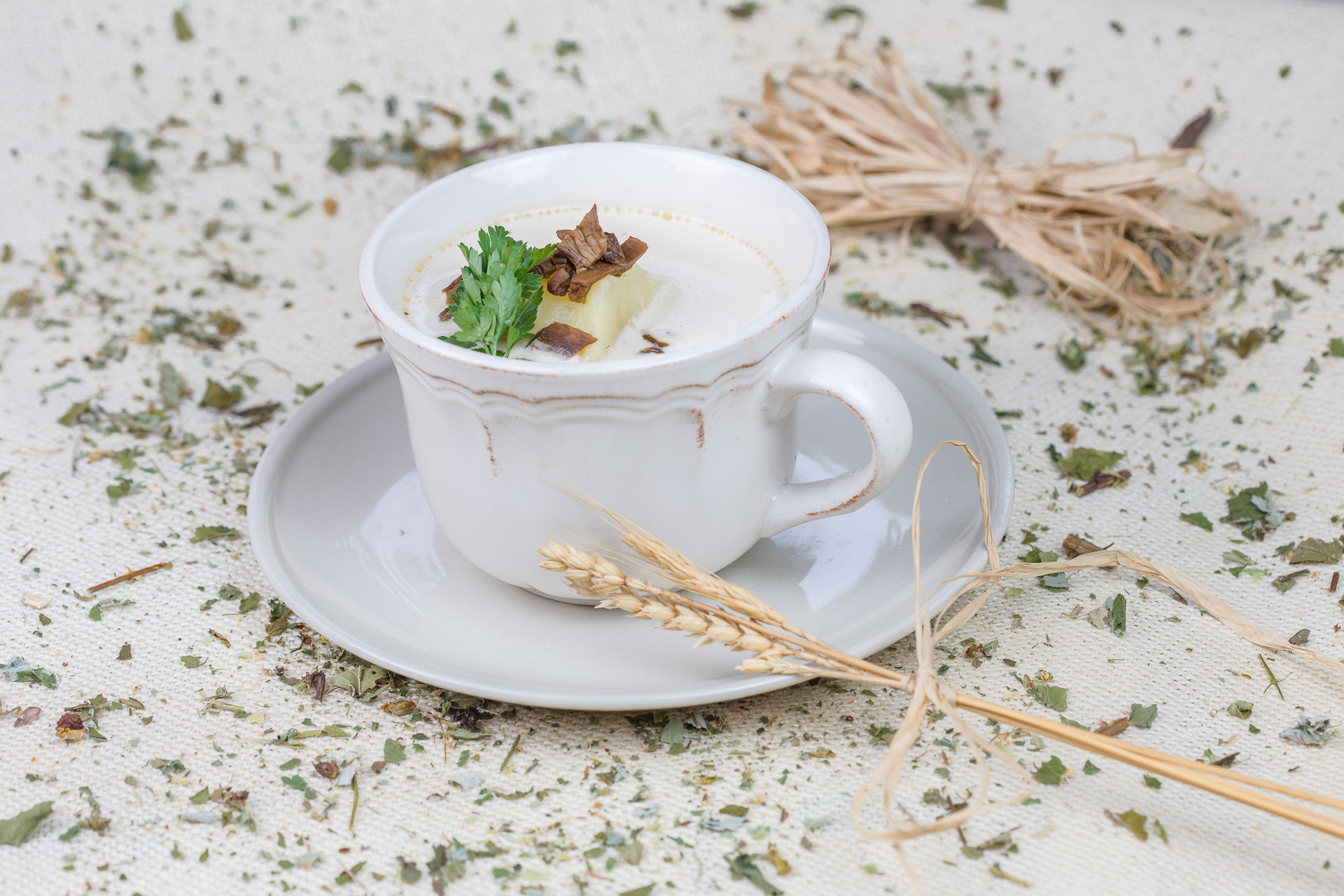 100 g borowika suszonego namoczyć w zimnej wodzie na około 20 minut. Do garnka wlać 600 ml soku z kiszonej kapusty, zagotować. Dodać śmietanę i zahartować. Całość zagotować. Zdjąć z palnika i dodać 20 g masła. Suszone borowiki gotować do miękkości w tej samej wodzie co się moczyły. Osobno gotować, do miękkości, w osolonej wodzie 4 średnie obrane ze skórki ziemniaki.
