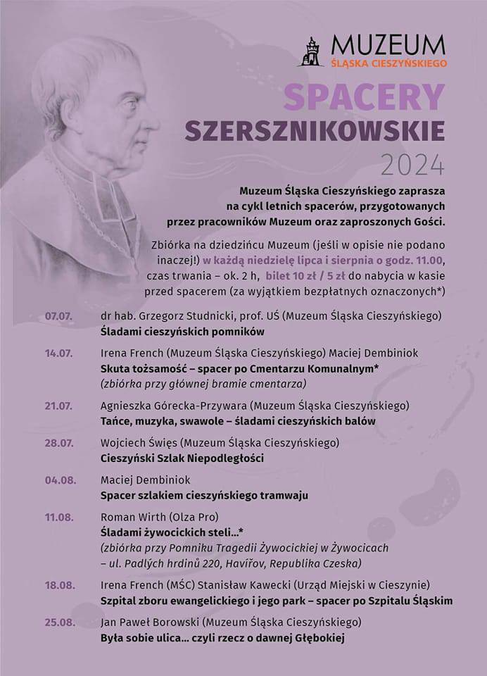 - 04.08.2024 - godz. 11:00: "Spacer szlakiem cieszyńskiego tramwaju" - Prowadzi Maciej Dembiniok - zbiórka na dziedzińcu Muzeum Śląska Cieszyńskiego