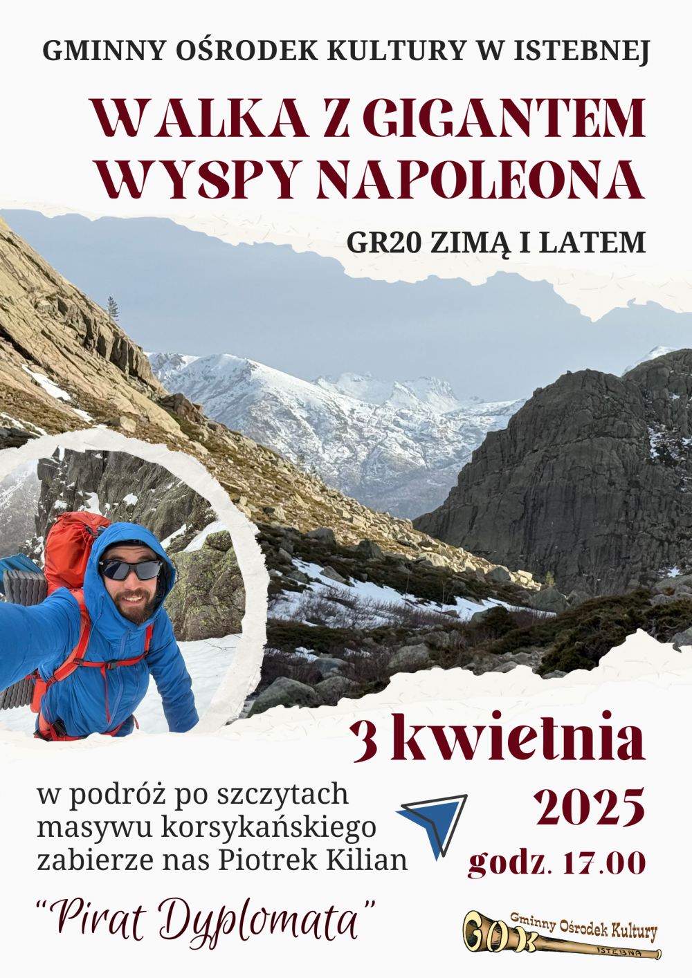 Piotrek Kilian „Pirat Dyplomata” zabierze nas w podróż po szczytach masywu korsykańskiego, opowie o surowym pięknie tych gór, śnieżnych burzach i samotnej walce z bezlitosną naturą wyspy Napoleona.