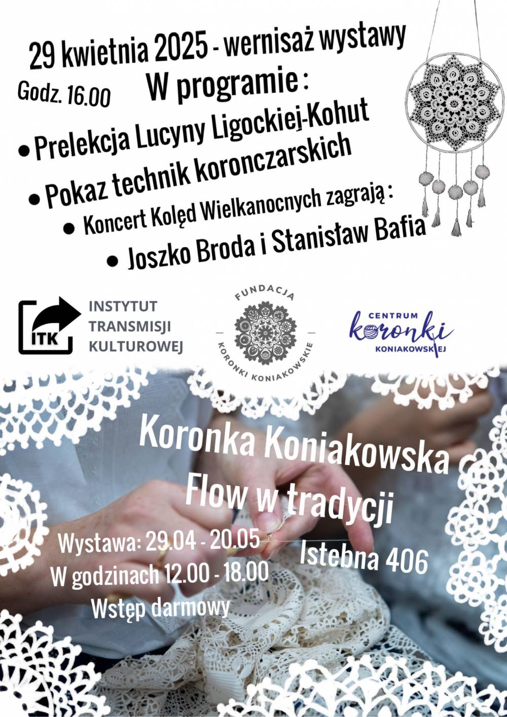Instytut Transmisji Kulturowej oraz Fundacja Koronki Koniakowskiej mają zaszczyt zaprosić na wernisaż wystawy „Koronka Koniakowska. Flow w tradycji”, który odbędzie się 29 kwietnia 2025 roku o godzinie 16:00 w siedzibie Instytutu Transmisji Kulturowej (Istebna 406).