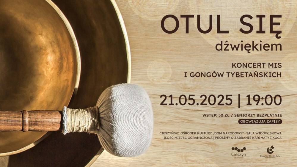 Cieszyński Ośrodek Kultury "Dom Narodowy" zaprasza na kąpiel w dźwiękach gongów i mis tybetańskich. Dźwięki podczas koncertu wpłyną na nasze ciała i emocję oraz wprowadza nas w stan głębokiego relaksu. Wsłuchanie się w dźwięki mis daje możliwość uspokojenia emocji i myśli, powodując najczęściej ogólne rozluźnienie napięć w całym ciele.