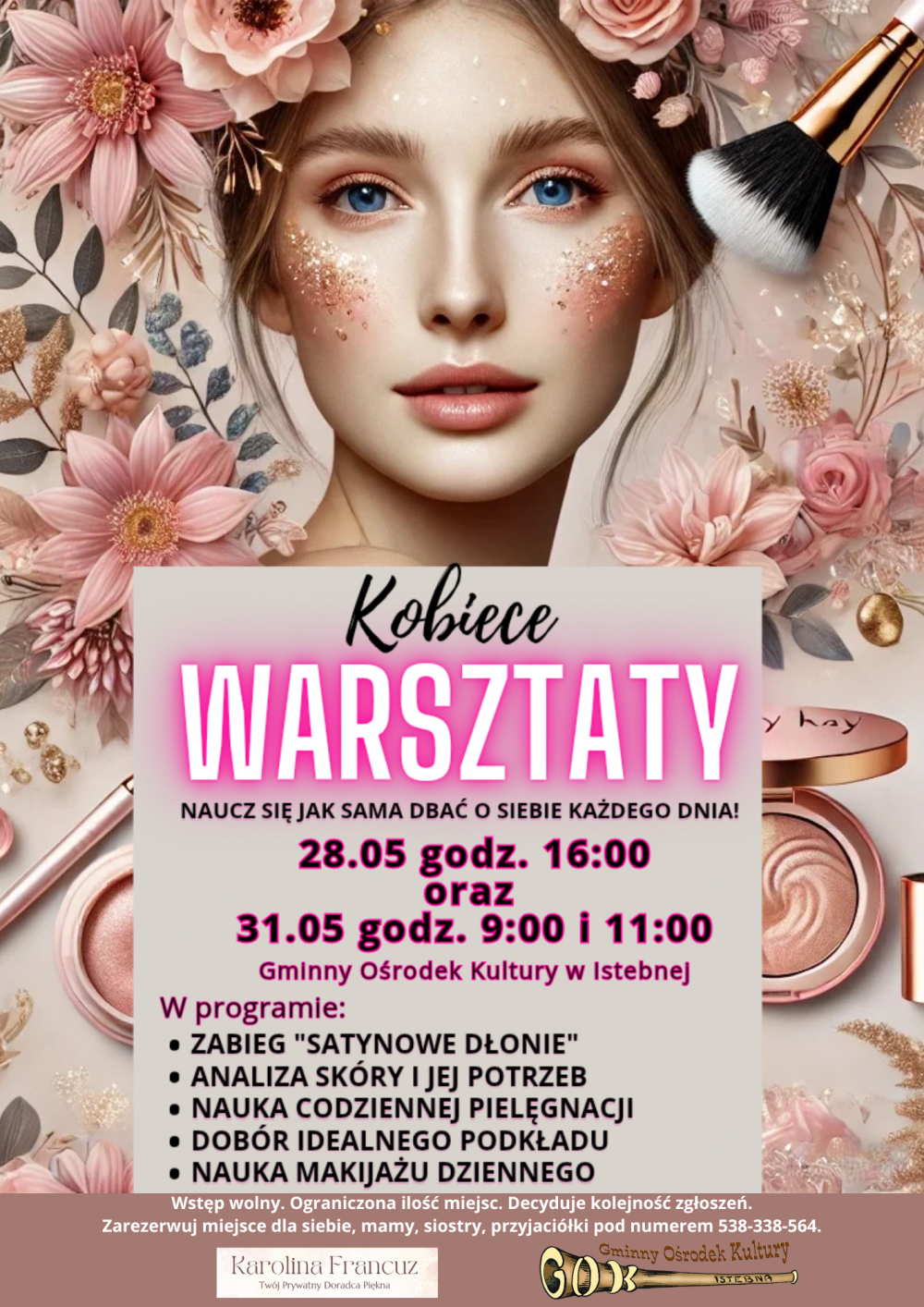 Karolina Francuz oraz Gminny Ośrodek Kultury w Istebnej serdecznie zapraszają na Kobiece Warsztaty podczas których każda z Pań będzie miała okazję by nauczyć się jak samodzielnie zadbać o siebie każdego dnia.