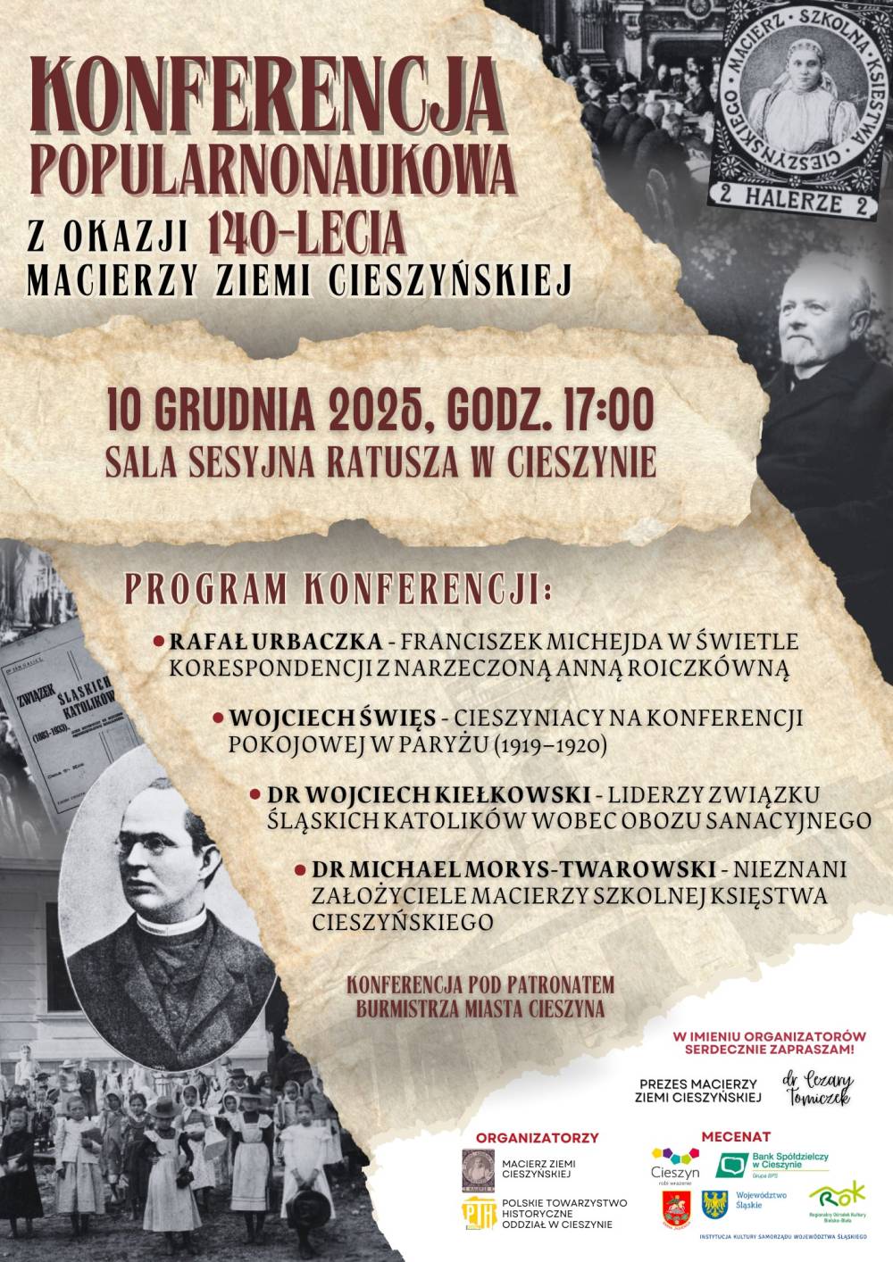 Zapraszamy na Konferencję Popularnonaukową z okazji 140-lecia Macierzy Ziemi Cieszyńskiej, ktróra odbędzie się 10 grudnia 2025 roku o godzinie 17:00 w Sali Sesyjnej Ratusza w Cieszynie.