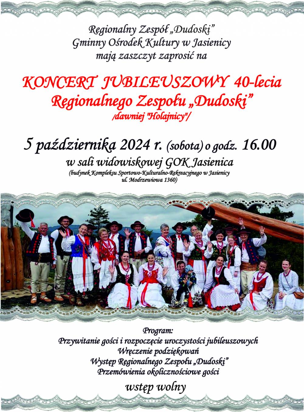 Regionalny Zespół "Dudoski" Gminny Ośrodek Kultury w Jasienicy mają zaszczyt zaprosić na Koncert Jubileuszowy 40-lecia Regionalnego Zespołu "Dudoski" /dawniej "Holajnicy"/ .