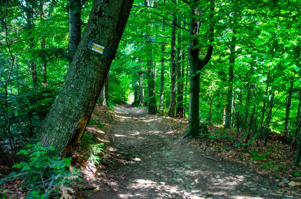 Szlak: żółty z Jeleśni do rozstaju pod szczytem Gachowizny, niebieski z Gachowizny do Huciska